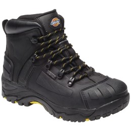 Norme EN ISO 20345.Tige cuir fleur de vachette imperméable noir.Semelle PU double densité.Doublure non tissée.Soufflet PU rembourré.Col PU noir rembourré.Renfort devant PU.