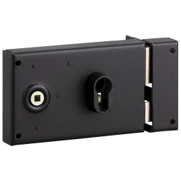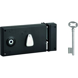 Serrure à crochet en tôle galvanisée.Livrée avec gâche et cylindre européen + 3 clés.Profondeur d'encastrement : 96 mm.Entraxe cylindre : 60 mm.Entraxe de fixation : 174 mm.