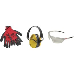 Kit de protection OREGON comprenant :1 protège oreilles Q515060. 1 paire de gants de travail taille M.1 paire de lunettes.Livré en boite carton couleur.